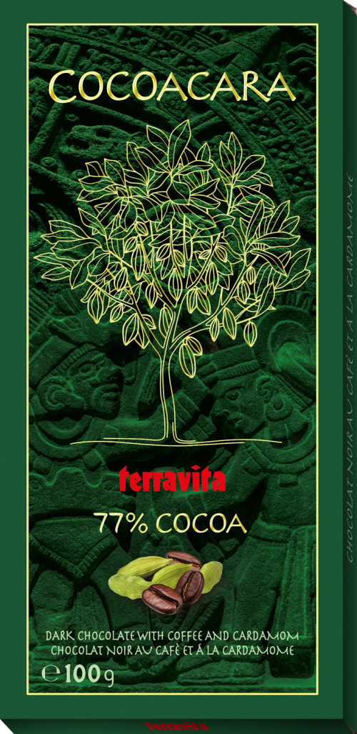 Czekolada Terravita Cocoacara 77% kakao Z KAWĄ I KARDAMONEM 100 g – oryginalne zestawienie gorzkiej czekolady z wyrafinowanymi, delikatnie korzennymi nutami szlachetnego kardamonu i pobudzającą zmysły kawą. Niebanalna kompozycja smaków i aromatów przenosi myślami w egzotyczne klimaty, dając jedyne w swoim rodzaju wrażenia.