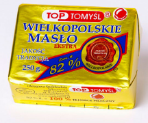 Masło Extra TOP-TOMYŚL produkowane jest wyłącznie ze śmietanki otrzymywanej z mleka krowiego. Zawiera 82% tłuszczu mlecznego. Posiada naturalny smak i zapach, doceniany przez smakoszy w całym kraju.