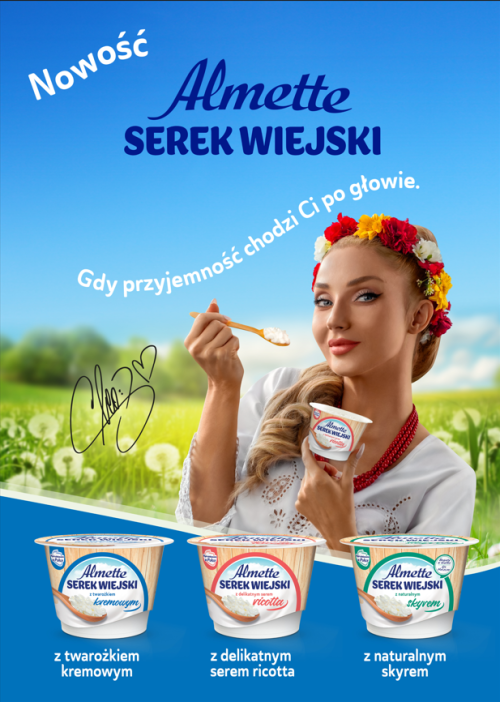 Serki wiejskie to najnowsza propozycja w ofercie Almette. Marka wprowadziła na rynek niespotykane do tej pory warianty smakowe, aby każdy mógł wybrać coś dla siebie. Do wyboru są trzy różne smaki - kształtne ziarenka serka wiejskiego zanurzone są w trzech różnych „śmietankach”: z dodatkiem sera ricotta o charakterystycznej słodkawej nucie, z dodatkiem jedynego w swoim rodzaju śmietankowego serka Almette lub z dodatkiem lekko kwaśnego naturalnego jogurtu typu islandzkiego skyr z wysoką zawartością białka i 0% tłuszczu. Jedzenie serków wiejskich to prawdziwa frajda! Już się pewnie domyślacie, że to właśnie taka przyjemność chodzi mi po głowie na scenie i nie tylko... Cóż mogę powiedzieć więcej – ta przyjemność będzie jeszcze grana nie raz! – opowiada Cleo.