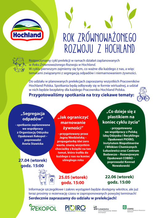 Świętowanie Dnia Ziemi startem cyklu proekologicznych prelekcji zaplanowano w ramach działań Roku Zrównoważonego Rozwoju w Hochland. Tematem przewodnim cyklu jest to, co ważne dla każdego z nas, a więc segregacja odpadów i niemarnowanie żywności.  Do udziału w prelekcjach zaproszeni są wszyscy pracownicy Hochland Polska. Spotkania będą odbywały się w formie wirtualnej, a udział w nich jest bezpłatny dla każdego pracownika Hochland Polska. Spotkanie otwierające na temat „Segregacji odpadów” - we współpracy z Organizacją Odzysku i Recyklingu Opakowań Rekopol – poprowadzi Anna Stawicka. Drugi temat „Jak ograniczyć marnowanie żywności” – został przygotowany przez Jagnę Niedzielską – propagatorkę idei zero waste. Ten cykl prezentacji zakończy prelekcja „Co dzieje się z plastikiem na koniec cyklu życia” - przygotowana we współpracy z Polską Izbą Odzysku i Recyklingu Opakowań PIOIRO, Instytutem Biopolimerów i Włókien Chemicznych Łukasiewicz oraz Centrum Badawczo – Rozwojowym Opakowań COBRO, a poprowadzi ją Konrad Nowakowski.
