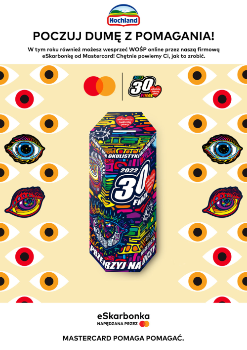 Hochland Polska – jako firma - także dokona wpłaty na swoją eSkarbonkę, dodatkowo przekaże kosze z pysznymi serami na licytację, między innymi dla sztabu WOŚP w Kaźmierzu i Szamotułach. 30. Finał WOŚP zagra 30 stycznia 2022 roku dla zapewnienia najwyższych standardów diagnostyki i leczenia wzroku u dzieci! WOŚP gra w tym roku dla okulistyki dziecięcej, zagrajmy razem z WOŚP!
