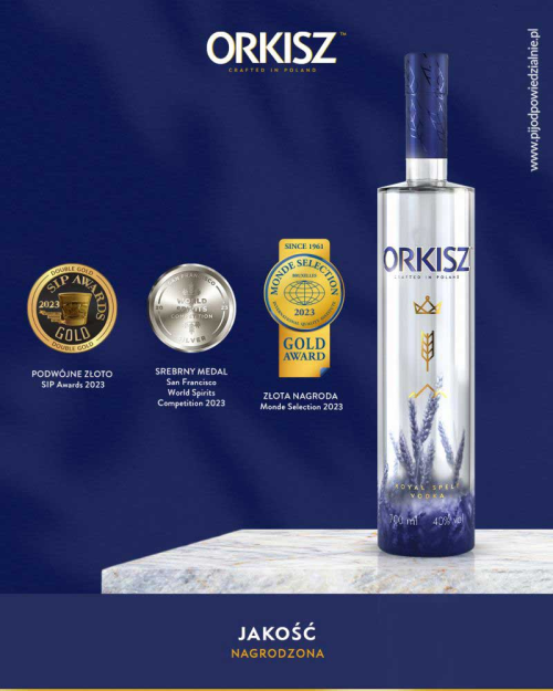 ORKISZ to wódka z segmentu ultra premium, która zadowoli każdego konesera mocnych trunków. Wytwarzana jest z wyjątkowej prapszenicy Triticum spelta. Wytwarzana jest w małych ilościach dzięki czemu charakteryzuje ją niezrównana łagodność oraz subtelny i niepowtarzalny smak. Opakowanie wódki Orkisz cechuje minimalistyczny design. Ponadto wyróżnia się zamknięciem w postaci korka, co stanowi unikalne rozwiązanie dla tego rodzaju alkoholi. Na tyle butelki znajduje się zadruk nadający jej głębi – widnieją na nim kłosy pszenicy orkisz. Na froncie widać nadrukowany logotyp i złote piktogramy, odwołujące się do tradycji wytwarzania tego trunku. Wyjątkowość marki doceniło eksperckie, międzynarodowe jury przyznając jej medale w konkursach Monde Selection, San Francisco World Spirits Competition oraz The SIP Awards.