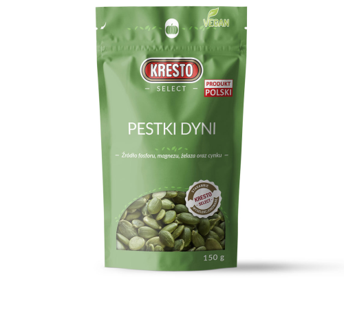 Kresto Select pestki dyni bez łupin to produkt zawierający starannie wyselekcjonowane, pochodzące wyłącznie z polskich upraw, pestki dyni, pełne wartościowych składników odżywczych fosforu, magnezu, żelaza oraz cynku. Żelazo pomaga w prawidłowym funkcjonowaniu układu odpornościowego, a cynk pomaga zachować zdrowe włosy, paznokcie oraz skórę. Oba produkty są doskonałym dopełnieniem zbilansowanej diety i stanowią zdrową alternatywę dla słodkich przekąsek.