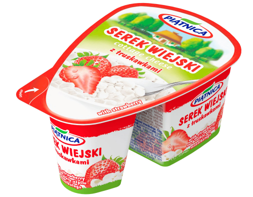 Dzięki wygodnemu, dwudzielnemu opakowaniu, delikatne ziarenka serka można łatwo połączyć z pysznymi owocami, które smakują jak te z babcinej konfitury. To piątnicki sposób na mały, smaczny posiłek. Tradycja i nowoczesność w jednym kubeczku! Dzięki właściwościom odżywczym, Serki wiejskie z owocami z Piątnicy mogą być pożywnym śniadaniem, przyjemnym deserem czy też zdrowszą alternatywą dla słodkich przekąsek. Dostępne są w 6 różnych wariantach z dodatkiem truskawek, ananasa, brzoskwini, jagody, malin z żurawiną oraz miodu.