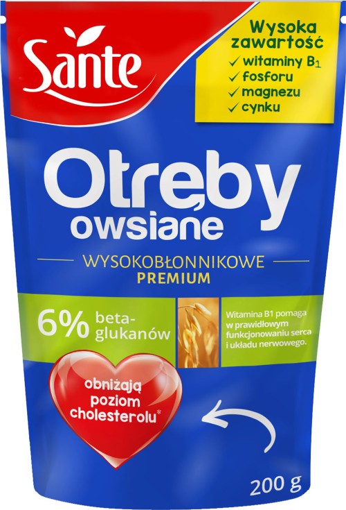 Wiele badań naukowych potwierdziło, iż otręby owsiane mogą obniżać poziom tzw. „złego” cholesterolu, uznawanego za czynnik rozwoju choroby wieńcowej serca. Jest to możliwe dzięki obecności beta-glukanów, czyli rozpuszczalnego błonnika pokarmowego. To z całą pewnością dobra wiadomość – ale ważne jest, jakie otręby owsiane wybierzemy. Jeśli chcemy w pełni skorzystać z dobroczynnego wpływu beta-glukanów, powinniśmy sięgnąć po czyste otręby, które zawierają nie mniej niż 6% beta-glukanów i 19% błonnika. Takie parametry wyróżniają Otręby owsiane wysokobłonnikowe Sante. Powstają one w procesie produkcji otrębów. Warto pamiętać, że na rynku dostępne są również otręby, które są pozostałością po produkcji płatków owsianych – jednak one zawierają dużo mniej cennych substancji (do 3,5% beta-glukanów i tylko ok. 12% błonnika).