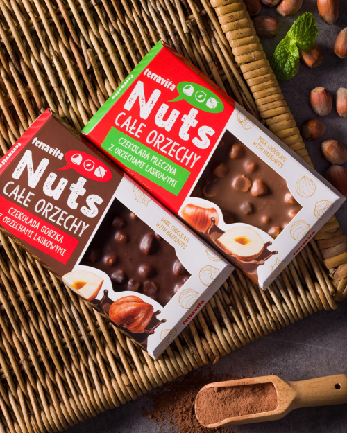 Przyjemność, którą można zobaczyć, zanim się jej posmakuje – to oczywiście kultowe czekolady „z okienkiem”. Jedne z najpopularniejszych i najbardziej lubianych, a przy tym – budzące mnóstwo nostalgicznych wspomnień. Przez charakterystyczne okienko można zobaczyć całe orzechy laskowe, zatopione w wyśmienitej czekoladzie. Terravita oferuje dwie wersje tego przysmaku – zachwycającą delikatnością Czekoladę mleczną z orzechami laskowymi oraz intensywną w smaku, wytrawną Czekoladę gorzką z orzechami laskowymi, która zawiera aż 70% kakao. Połączenie głębi kakaowych nut smakowych z chrupiącymi orzechami to wyśmienita kompozycja.