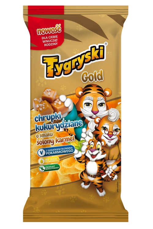 Nowe Tygryski GOLD to trzy wyjątkowe propozycje: pyszna papryka, aromatyczny ser i solony karmel. To właśnie te smaki zostały wybrane z pomocą seniorów z Uniwersytetu Trzeciego Wieku. Co jeszcze je wyróżnia? Chrupki zostały wzbogacone błonnikiem pokarmowym, rekomendowanym w diecie osób starszych i jako jedyne na rynku z tym składnikiem są bezglutenowe. W ich składzie nie znajdziemy również oleju palmowego ani wzmacniaczy smaku.